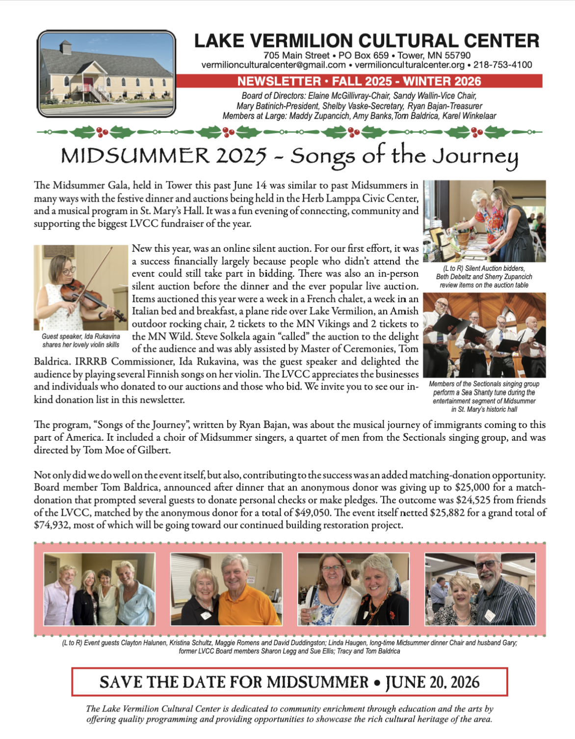 Lake Vermilion Cultural Center reports a record year of fundraising, major progress toward completing its historic building by fall 2026, and a full 2025 season of successful arts and cultural programs, with strong community support and gratitude.